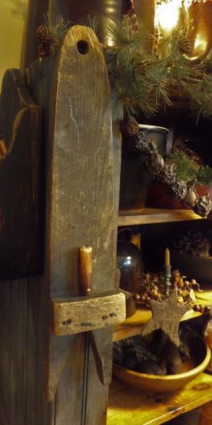 Primitive Early Look Triple Lighting, 3 Candle Stubs, Rustic Tobacco Lath Scoop