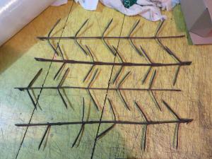 SET OF PRIMITIVE INSPIRED WOODEN HORN BEAMS W/ MAKE DO REPAIRS & LAVENDER-BEANS