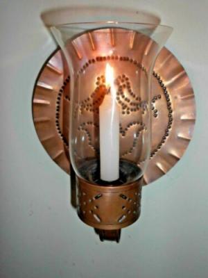 PRIMITIVE COPPER PFALTZGRAFF PUNCHED WALL CANDLE SCONCE,w/GLASS TOPPER