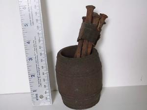 9 ANTIQUE 4 1/2" SQUARE IRON NAILS IN OLD MINIATURE CAST IRON NAIL KEG BARREL