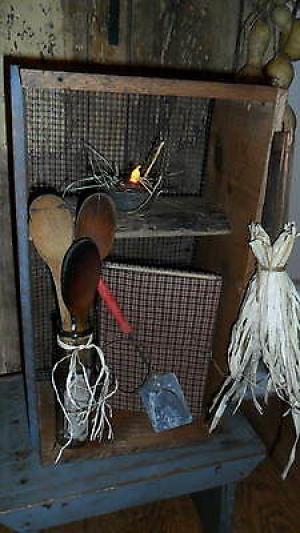 Primitive Early Look Cupboard, Old Screened Box w/Light,Whisk Broom,Book,Spoons