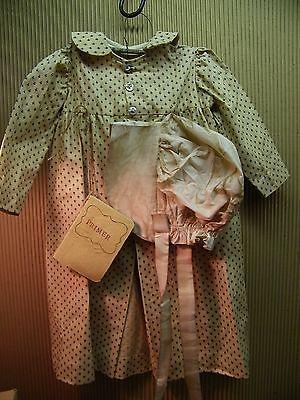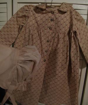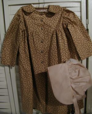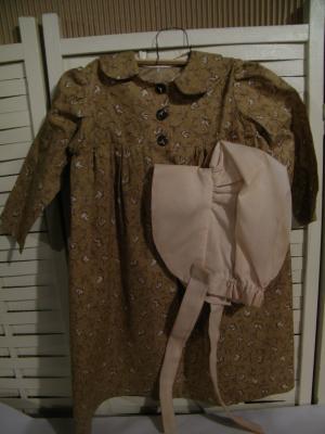 Primitive prairie lil' dress/bonnet/primer school thyme brown circles calico