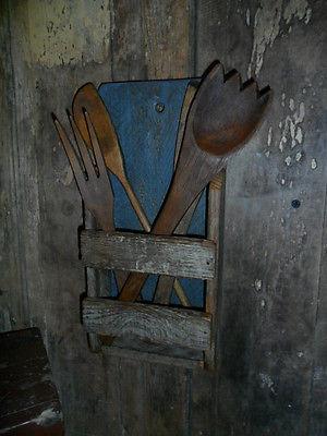 Primitive Rustic Wall Box, Early Look, 4 Old Wooden Utensils, Tobacco Lath, Blue