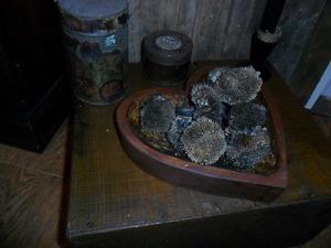 Primitive Wooden Heart Shaped Bowl, Nicely Carved, Filled w/Sunflower Heads