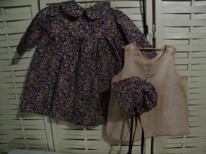 Primitive prairie lil' dress/bonnet/primer school thyme cream/brown/blue flower