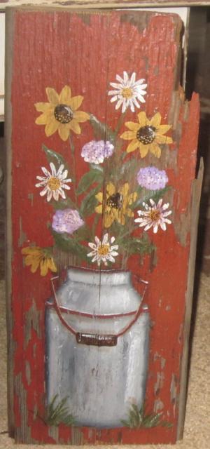 *~*PRIMITIVE*~*HP FOLK ART PRIM PAIL OF WILDFLOWERS *~* RECLAIMED RED BARN WOOD