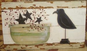 *~*PRIMITIVE*~* HP FOLK ART CROW *~* BOWL OF PIPS & STARS *~* OLD RECLAIMED WOOD