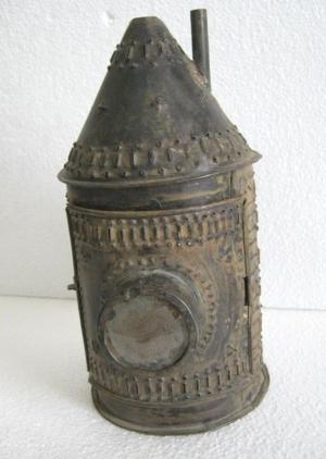 ANTIQUE PUNCHED TIN CANDLE HOLDER / LANTERN WITH TWO GLASSES