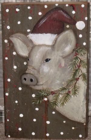 *~*PRIMITIVE*~* HP FOLK ART PRIM HOLIDAY PIG *~*CHRISTMAS *~* OLD RECLAIMED WOOD