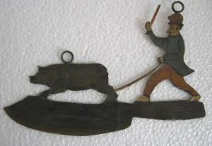 OLD IRON BUTCHERS STORE DISPLAY TRADE SIGN . MAN , KNIFE AND PIG