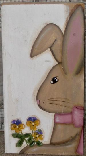 *~*PRIMITIVE*~* HP FOLK ART PRIM BUNNY *~* PANSIES *~* OLD RECLAIMED WOOD