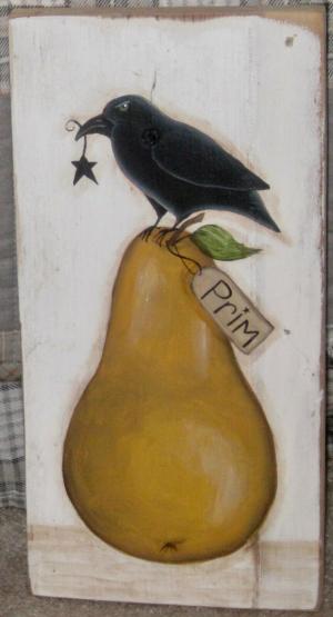 *~*PRIMITIVE*~* HP FOLK ART PRIM PEAR *~* CROW *~* OLD RECLAIMED WOOD