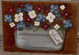*~*PRIMITIVE*~* HP FOLK ART PRIM PLANTER OF FLOWERS *~* WELCOME *~* BOARD