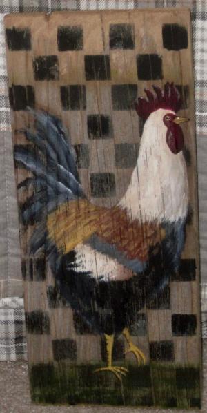 *~*PRIMITIVE*~*HP FOLK ART PRIM ROOSTER * CHECKERBOARD * OLD RECLAIMED WOOD