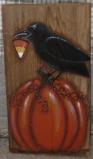 *~*PRIMITIVE*~* HP FOLK ART PRIM PUMPKIN * CROW * CANDY CORN *~* OLD BARN WOOD