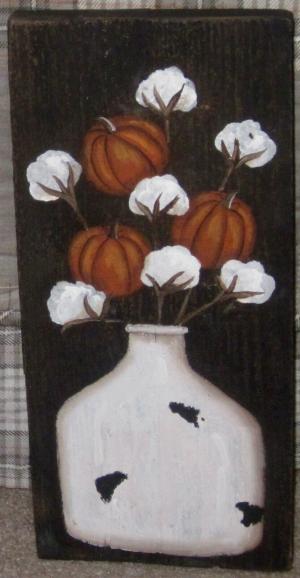 *~*PRIMITIVE*~* HP FOLK ART ENAMELWARE JUG * PUMPKINS * COTTON * RECLAIMED WOOD