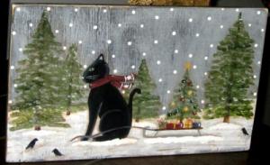 *~*PRIMITIVE*~* HP FOLK ART PRIM WINTER CAT SCENE * TREE * PRESENTS *~* BOARD