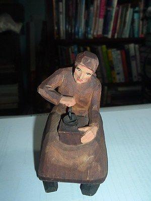 FOLK ART PRIMITIVE HANDCARVED WOOD FIGURE/WOMAN WITH COFFEE MILL