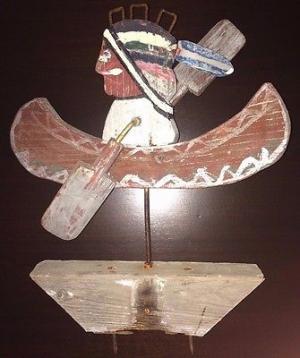 ANTIQUE VINTAGE PRIMITIVE MAN WITH FEATHER PADDLING A CANOE WIND SPINNER