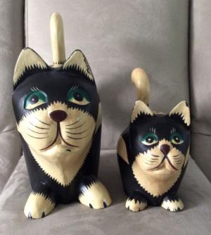 2 PRIMITIVE Hand Carved & Painted Wooden Black & White Cats Folk Art