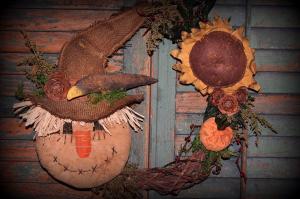 Primitive Grungy Fall Scarecrow & Sunflower Wreath with Crow