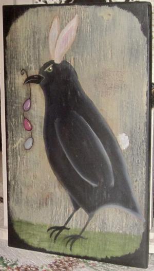 *~*PRIMITIVE*~* HP FOLK ART PRIM CROW BUNNY *~* EASTER *~ *~* BOARD