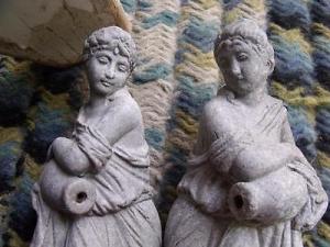 2 Vintage Shabby Primitive Cast Metal Figurines Ladies W/ Urns Lamps Fountains ?