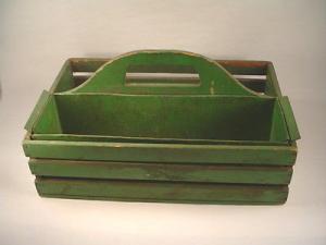 ~ Vtg RUSTIC GREEN PAINT PRIMITVE WOOD & METAL TRAY GARDEN TOTE TOOL CADDY