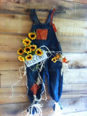 Primitive Folk ARt Farmhouse Door Charmer Wreath Decor overalls sunflowers Fall