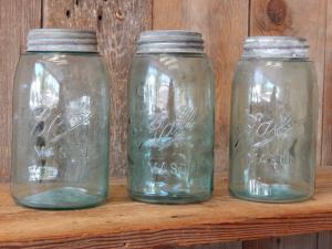 3 Antique Blue / Green Glass Ball Mason 3L Jars ~ Vintage Prim Farm Canisters