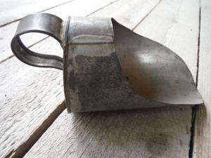 Antique Primitive Tin Scoop, soldered, coffee cup handle, 6" long - Nice!