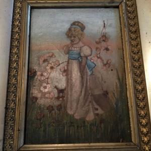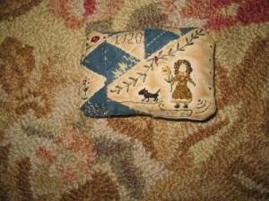 Primitive tiny Sampler Pillow~1720 Ms Maggie & Dog Molly ~Early Quilt~ Folk Art