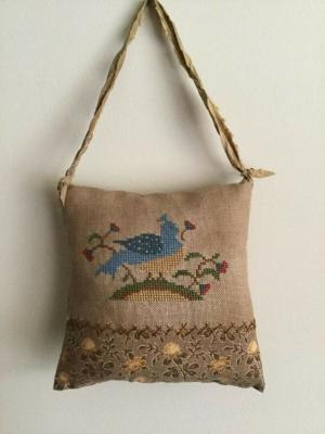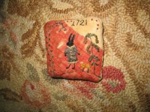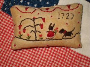 Primitive tiny Sampler Pillow 1721 Ms.Rabbit In A Garden~Early red quilt~Folky