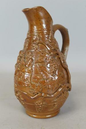 RARE 19TH C GERMAN ROYAL DOULTON STONEWARE SALT GLAZE EMBOSSED DECORATED JUG
