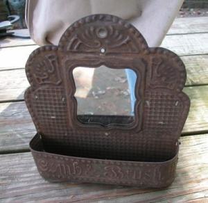Primitive Antique Tin Comb & Brush Wall Holder W/Replacement Mirror