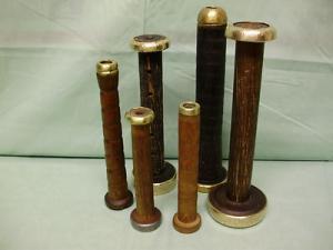 6 ANTIQUE VINTAGE WOOD TEXTILE MILL SPOOLS BOBBINS WITH BRASS 5 1/4" TI 8 1/2"