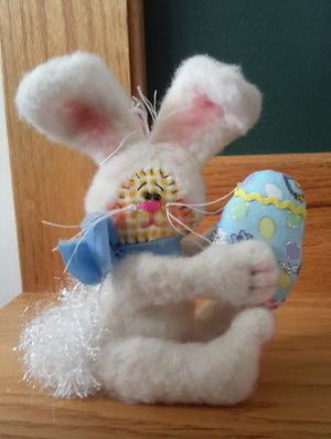 PRIMITIVE H/C FABRIC SHELF SITTING EASTER BUNNY HOLDING A EASTER EGG