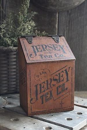 Primitive Early Homestead Look Small Wooden Slant Lid Advertising Tea Bin