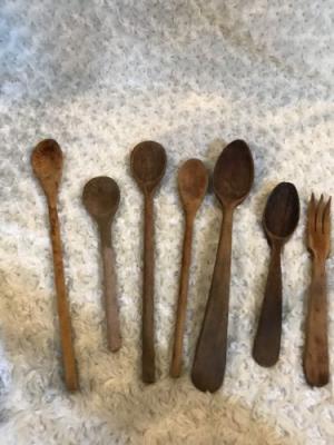 7 Vintage Wooden Spoons & Fork Farmhouse Kitchen Utensils Primitive Decor