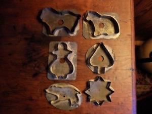 6 Antique Dark Tin Flatback Cookie Cutters - Lion, Cat, Girl, Spade, Bear, Star