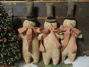 Primitive Grungy Snowmen Set of 3 Christmas Bowl Fillers, Shelf Tuck w/ Bow