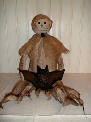 ♥ Primitive Grungy Spooky Halloween Ghost Doll & Little Bat ♥