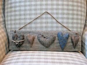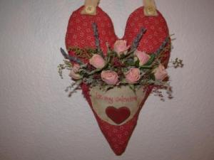 PRIMITIVE "BE MY VALENTINE" CRANBERRY RED PRINT HANGING HEART WITH BABY ROSES
