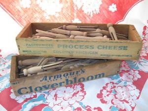 2 vtg wooden ARMOUR CHEESE BOXES +wood laundry CLOTHES PINS rustic cottage decor