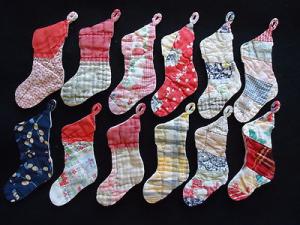 12 PRIMITIVE VTG CUTTER QUILT CHRISTMAS SANTA STOCKINGS - FOLK ART