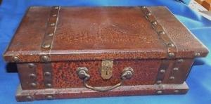 ANTIQUE WOODEN COPPER BOUND FOLK ART TREASURE CHEST MONEY