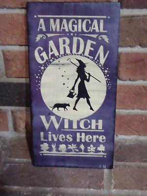 Primitive Wood Witch Sign“ A MAGICAL GARDEN WITCH LIVES HERE” Hp Purple Plum