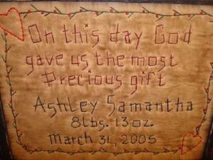Primitive Country Personalized ~BIRTH SAMPLER~ Stitchery 12" x 9 1/2"