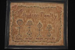 Primitive **PERSONALIZED STICK FAMILY** Stitchery in black frame 12" x 9 1/2"