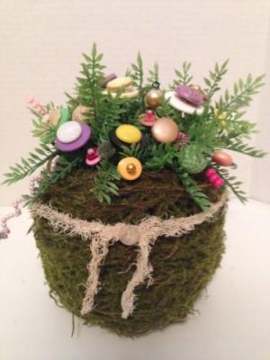 VTG Button Bouquet/Mossy Planter-Spring Country Prim Shabby Cottage Chic Decor